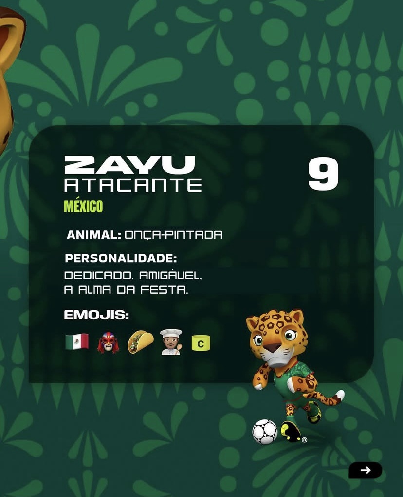Já o México trouxe força e garra para o campo com Zayu, um jaguar antropomórfico escolhido para ser o atacante, o número 9. Ele carrega não apenas a imponência do animal, mas também a celebração da tradição e da herança cultural mexicana. Tem a alma do hino “Mexicanos al grito de guerra”… A cada traço, o mascote mostra a energia vibrante do país e o jeito apaixonado de viver o futebol.
